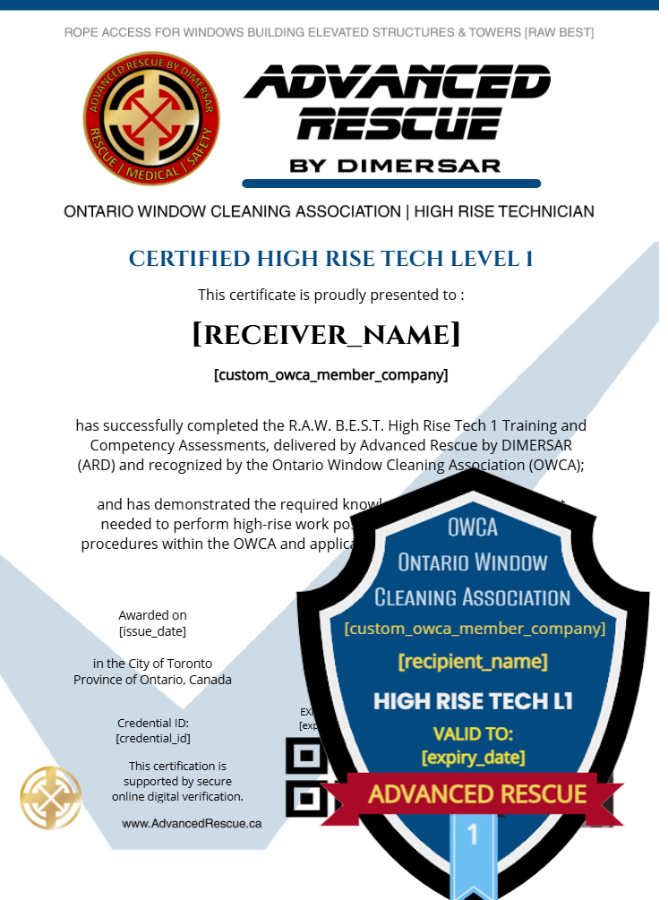 Advanced Rescue by DIMERSAR – Digital CredentialOWCA High Rise Technician – Level 1 This digital credential is issued by Advanced Rescue by DIMERSAR (ARD) and is recognized by the Ontario Window Cleaning Association (OWCA).It verifies that the holder has successfully completed the R.A.W. B.E.S.T. (Windows, Buildings, Elevated Structures & Towers) High Rise Technician – Level 1 training and co…